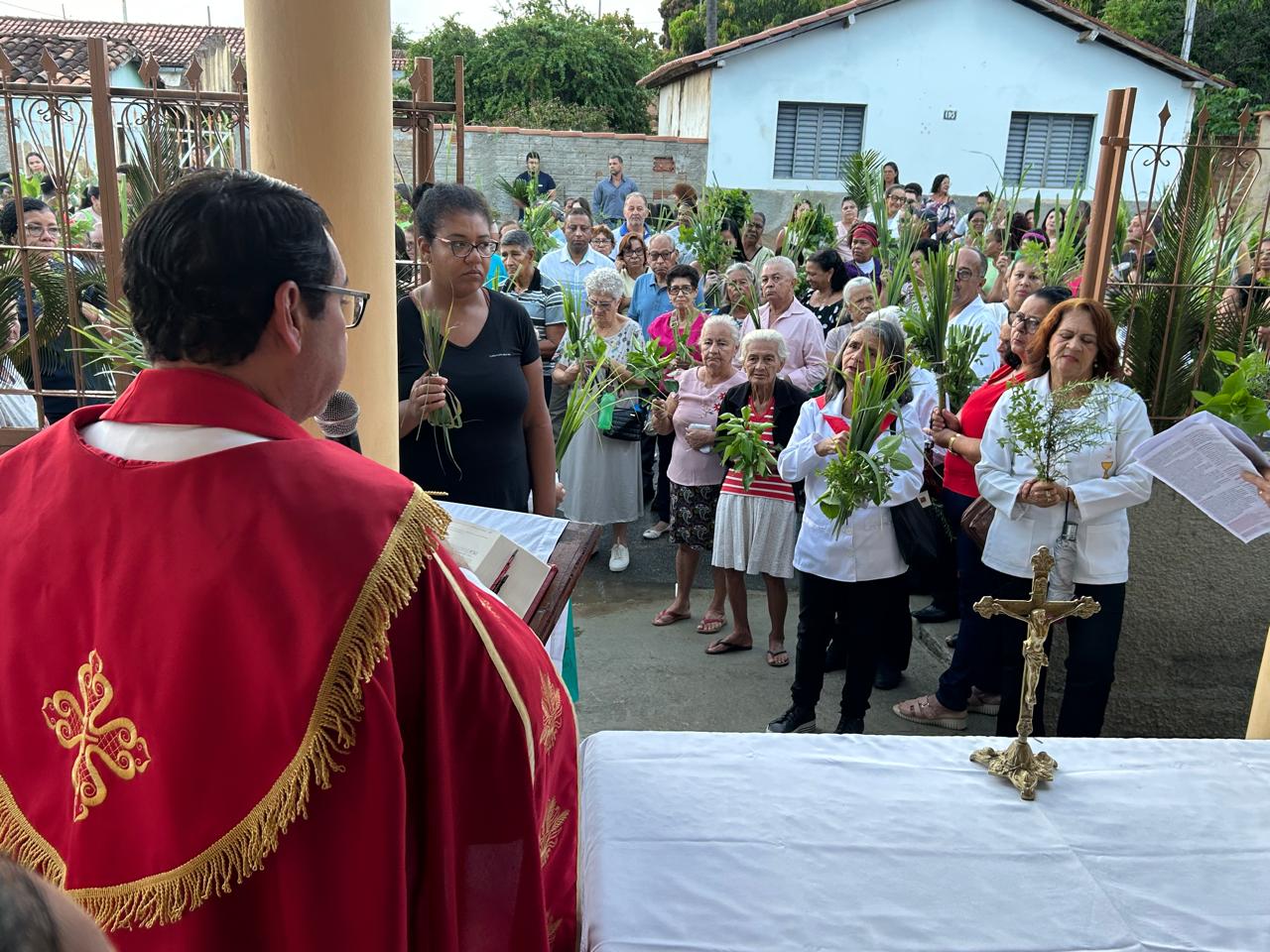 Ao repique festivo dos sinos, os participantes seguiram em procissão desde o portão de entrada da casa até a capela, recordando a entrada triunfal de Jesus em Jerusalém.