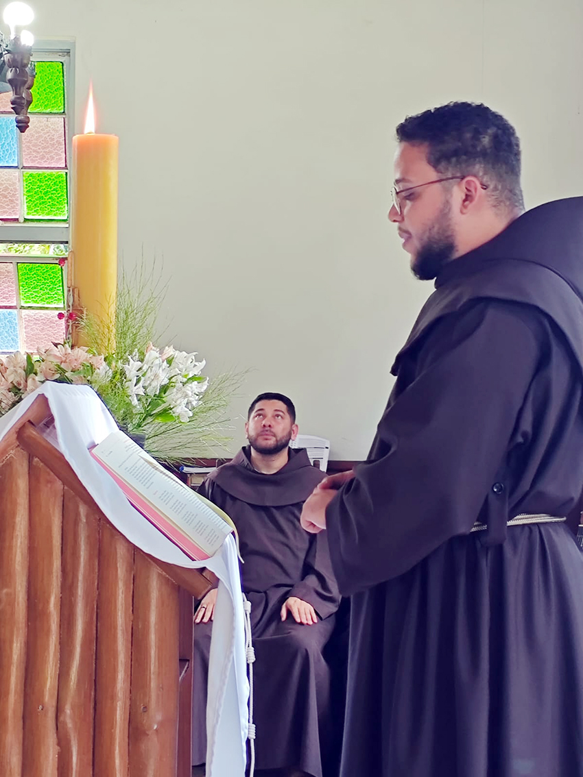 O evangelho do dia era João 20,1-9 – a corrida de Pedro e João ao sepulcro vazio. Frei Massimo iniciou sua exortação manifestando a alegria de celebrar a Páscoa “aqui com vocês em Santa Maria”. Agradeceu aos frades que deixaram seus lugares de missão, pela Semana Santa, para estarem ali: