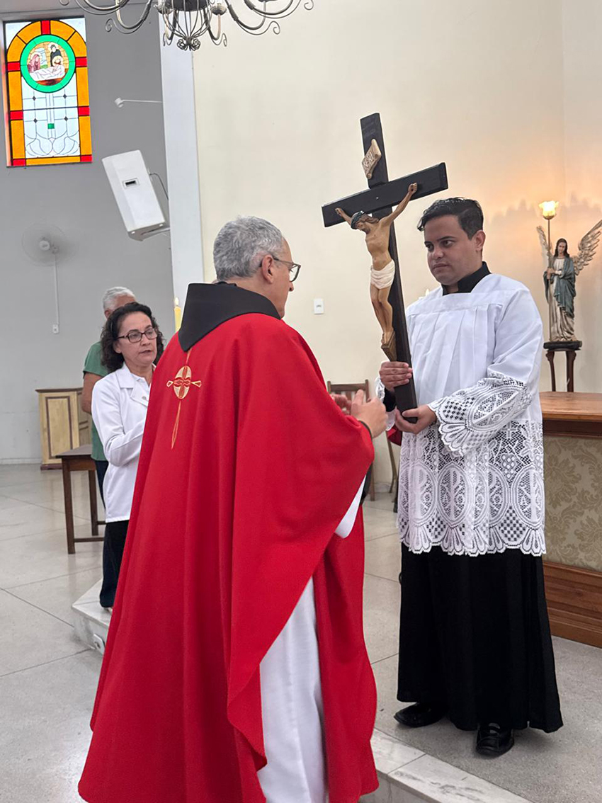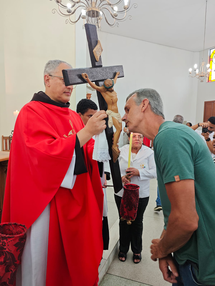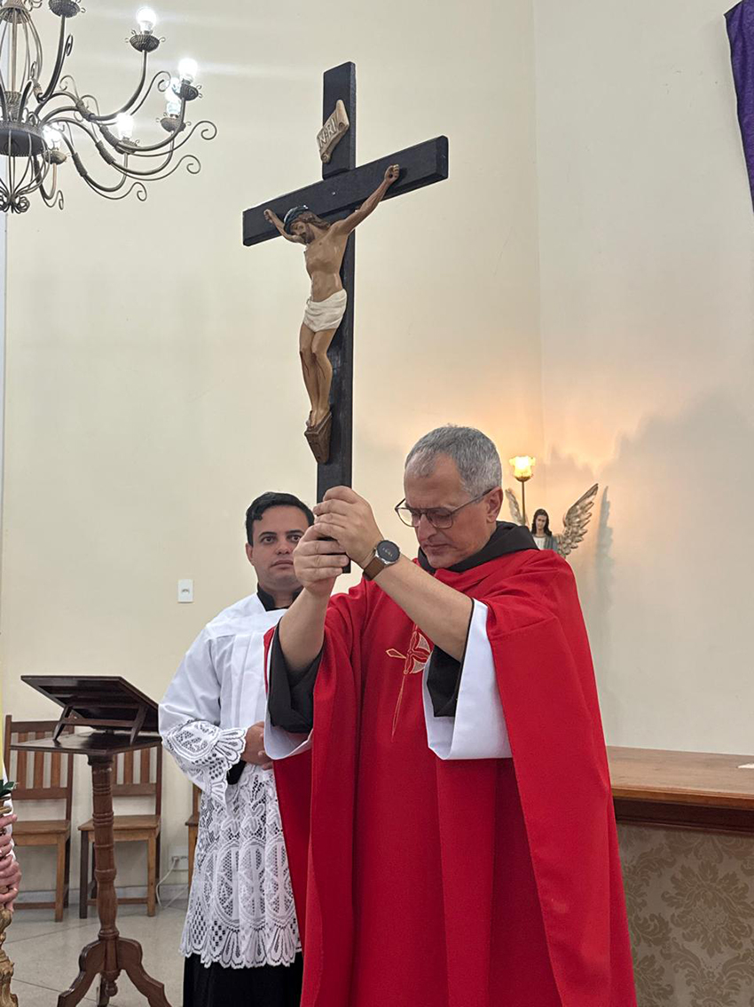 Às 15h, a comunidade do Senhor Bonfim, em Tiradentes, abriu suas portas para o rito litúrgico mais solene da Sexta-Feira Santa. Frei Massimo Fusarelli presidiu a Adoração da Cruz. Diante do madeiro que para o mundo é escândalo e loucura, o Ministro Geral exortou os fiéis com palavras que soaram como um eco do próprio Calvário: