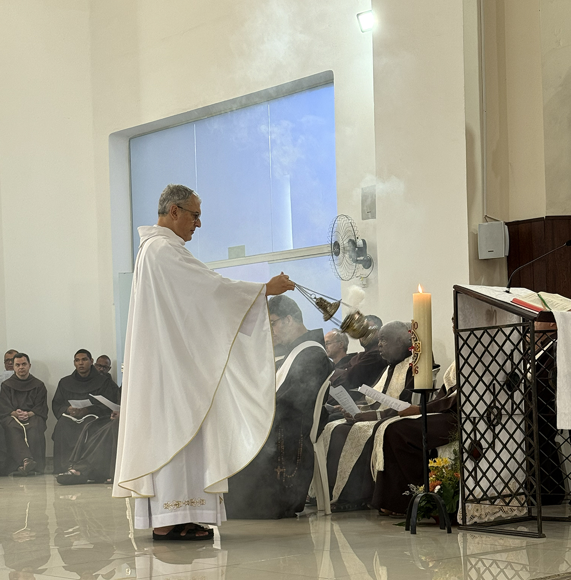 Os frades, ainda aquecidos pela emoção das visitas dos dias anteriores, adentraram ao espaço celebrativo com cantos de júbilo. O Círio Pascal, aceso na Vigília, brilhava junto à mesa da palavra. Frei Massimo, emocionado, iniciou a homilia com uma confissão: “Esses dias foram para mim um verdadeiro presente.”