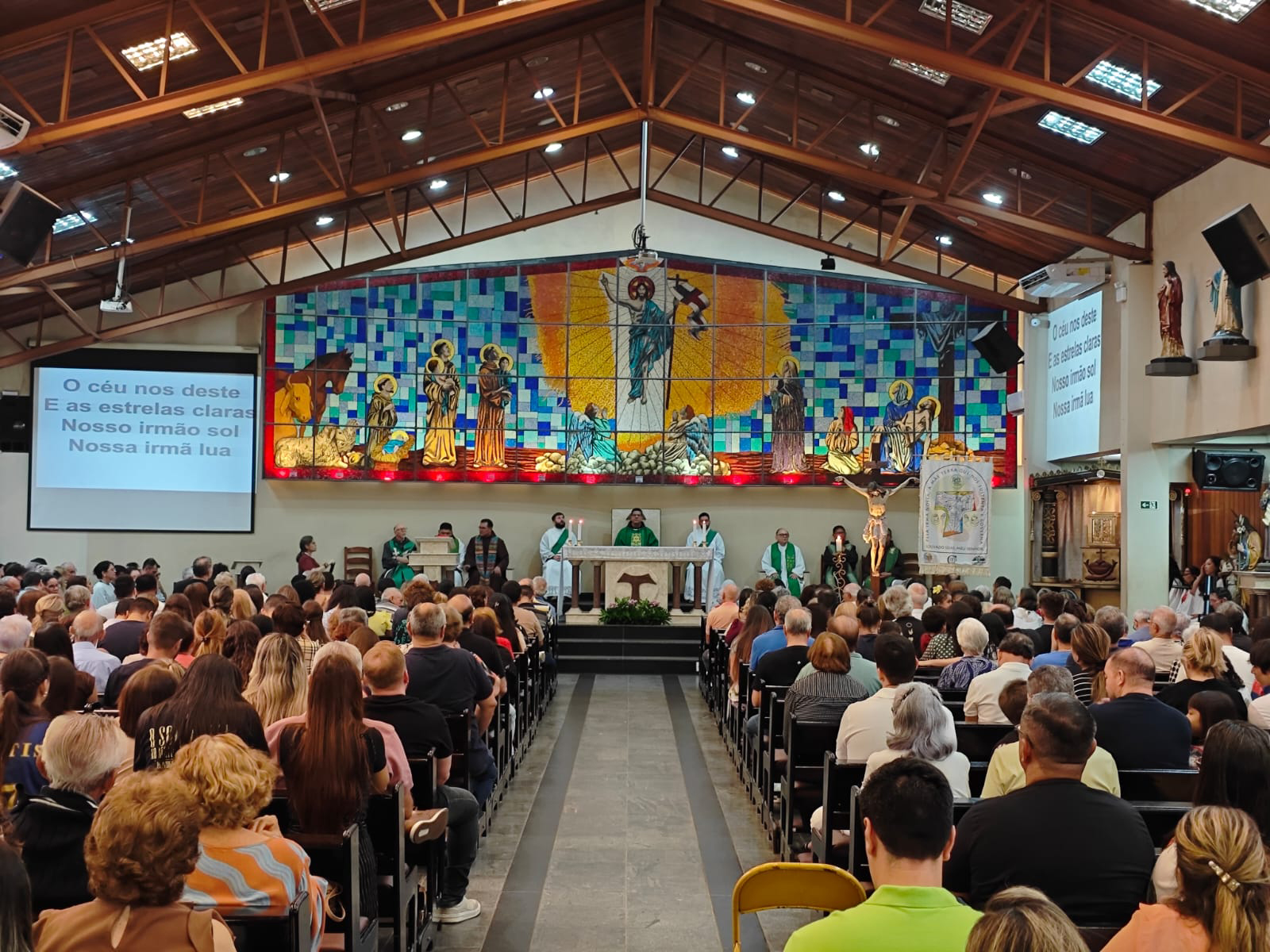 A celebração não se limitou ao espaço sagrado. A inauguração de um painel do artista Marcelo Zuffo (@mzuffoch) nos jardins da Praça Batista Campos funcionou como um marco da “fraternidade cósmica” – um conceito que, na visão de pensadores como Leonardo Boff, entende a humanidade como parte integrante e interdependente de uma grande comunidade de vida. A obra expressa a dimensão simbólica do encontro entre espiritualidade e cuidado com a Casa Comum, vividos intensamente por São Francisco de Assis em seu tempo.