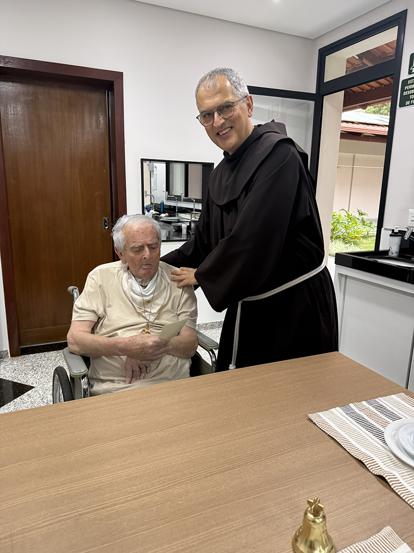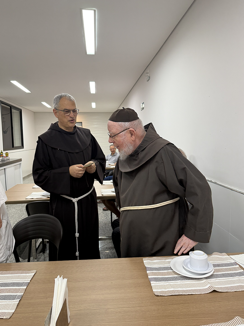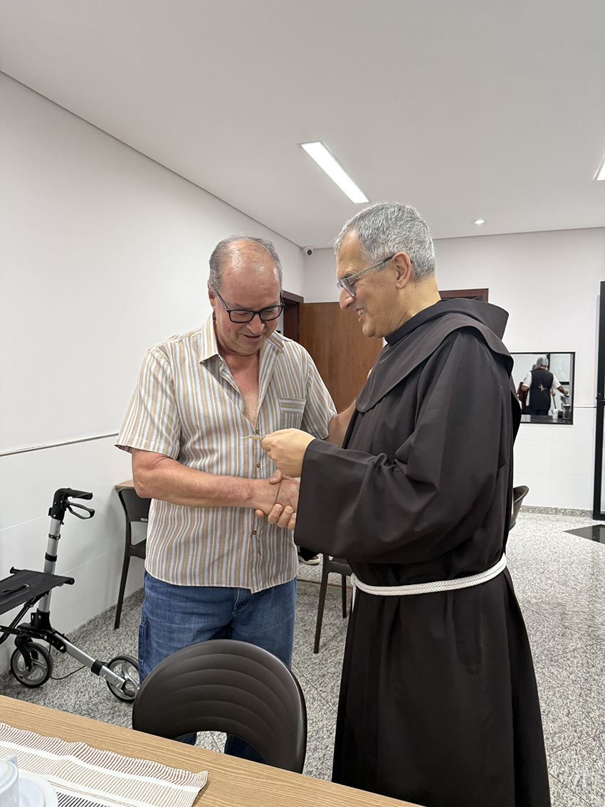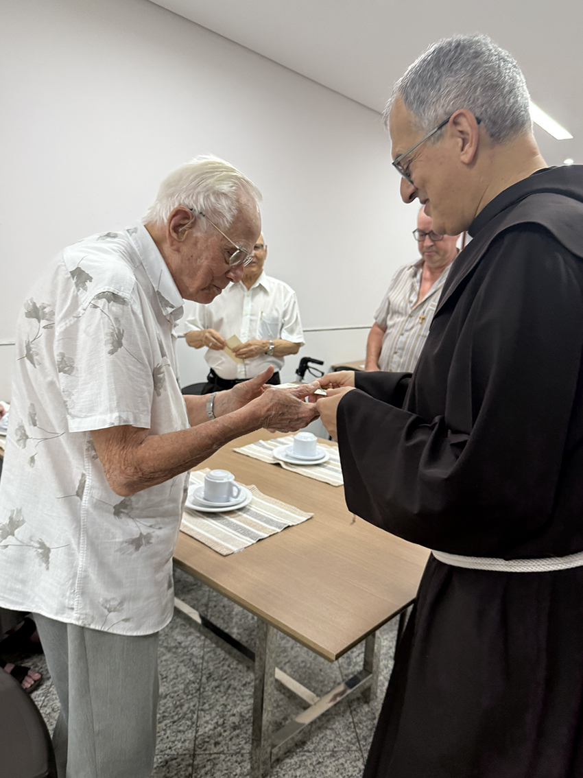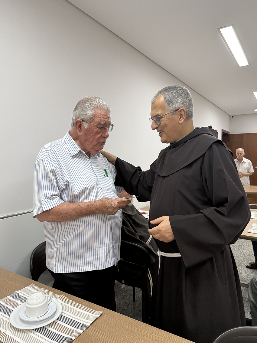E então, um gesto que comoveu a todos. Frei Massimo invocou uma bênção especial e ofertou um “tal” que fora abençoado, dias antes de sua vinda para o Brasil, na igrejinha da Porciúncula, a célula-mãe da Ordem dos Frades Menores. Aquele sinal, vindo do lugar onde Francisco compreendeu sua vocação, foi entregue como confirmação de uma vida doada como semente que hoje dá seus frutos na Província Santa Cruz. Os frades idosos, alguns deles vindos da Holanda há décadas, receberam o gesto com emoção, traduzido no abraço fraterno.