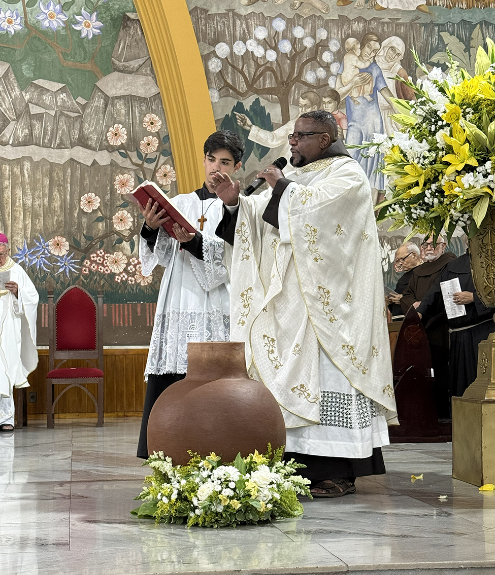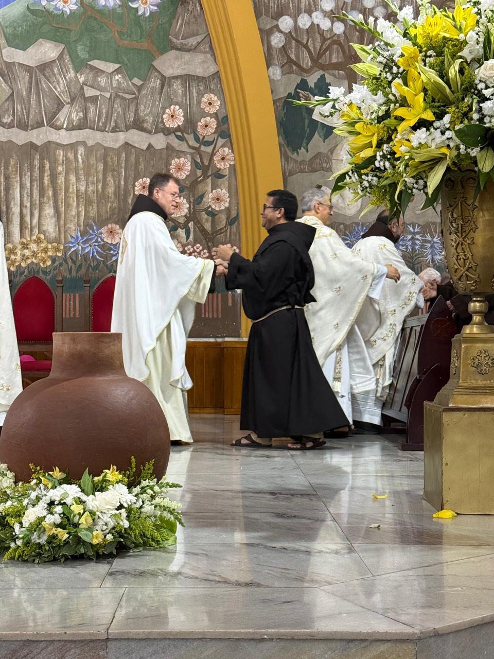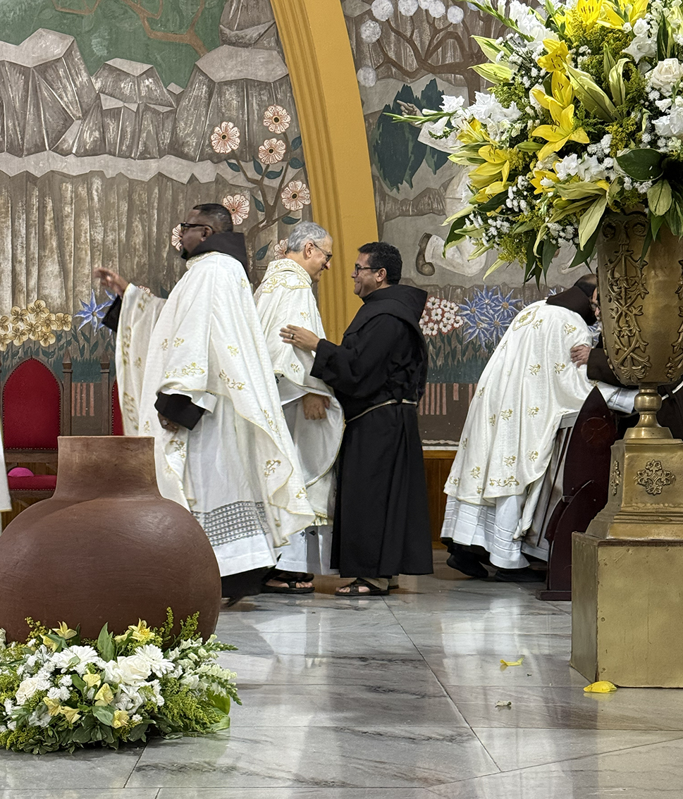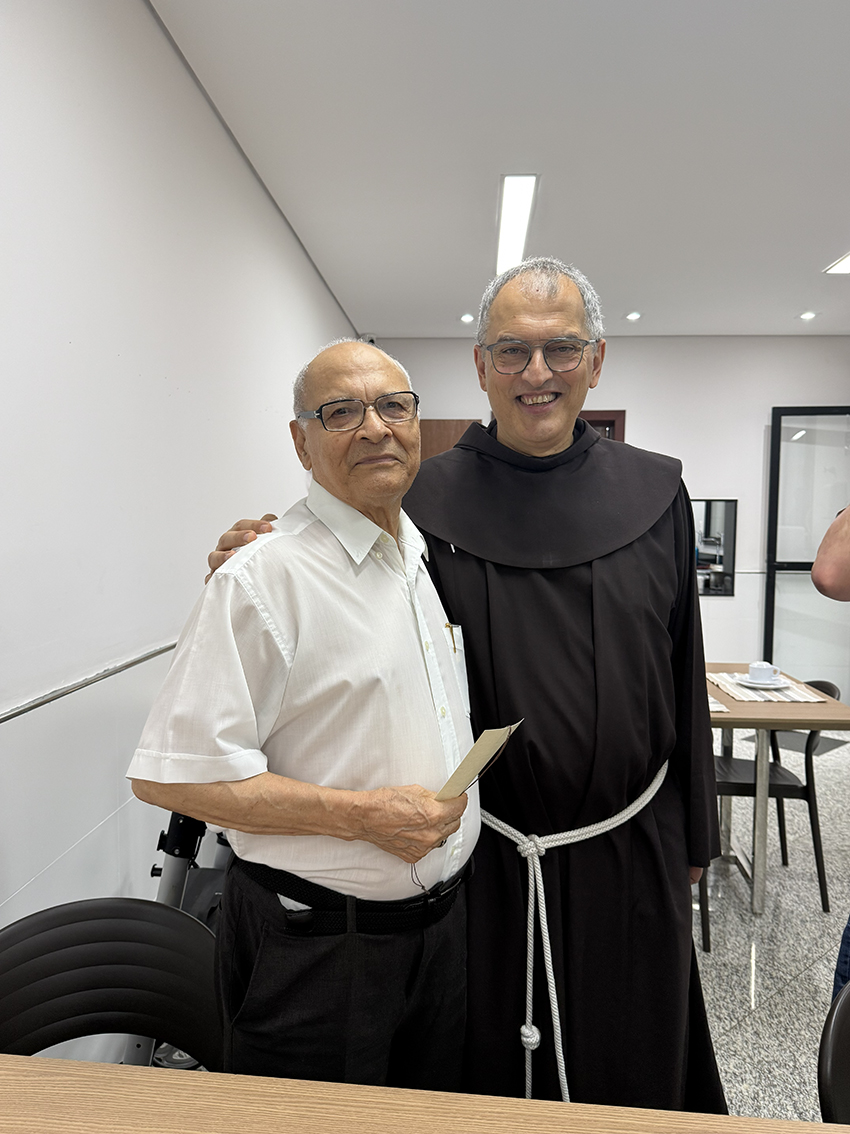 E então, um gesto que comoveu a todos. Frei Massimo invocou uma bênção especial e ofertou um “tal” que fora abençoado, dias antes de sua vinda para o Brasil, na igrejinha da Porciúncula, a célula-mãe da Ordem dos Frades Menores. Aquele sinal, vindo do lugar onde Francisco compreendeu sua vocação, foi entregue como confirmação de uma vida doada como semente que hoje dá seus frutos na Província Santa Cruz. Os frades idosos, alguns deles vindos da Holanda há décadas, receberam o gesto com emoção, traduzido no abraço fraterno.