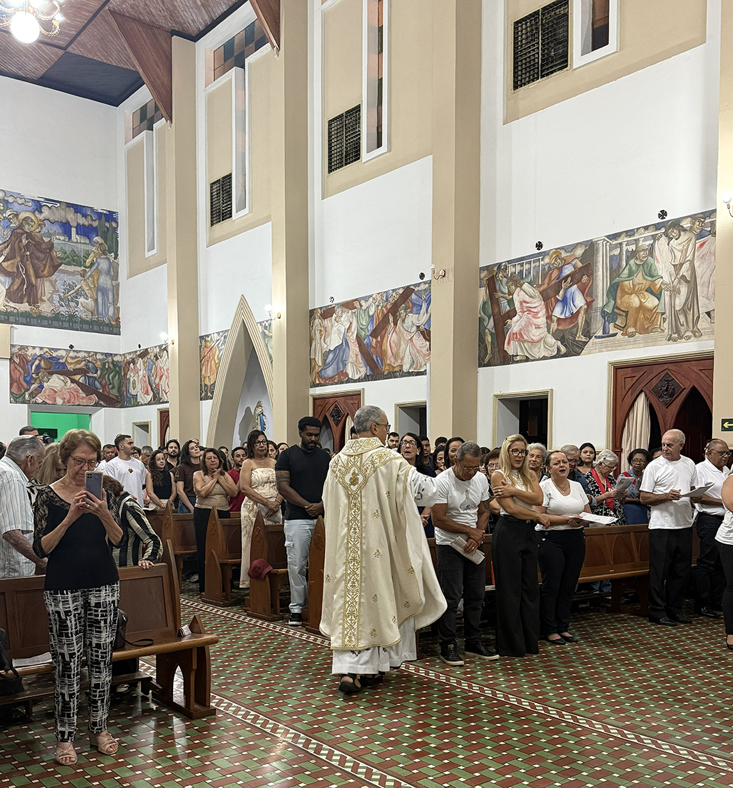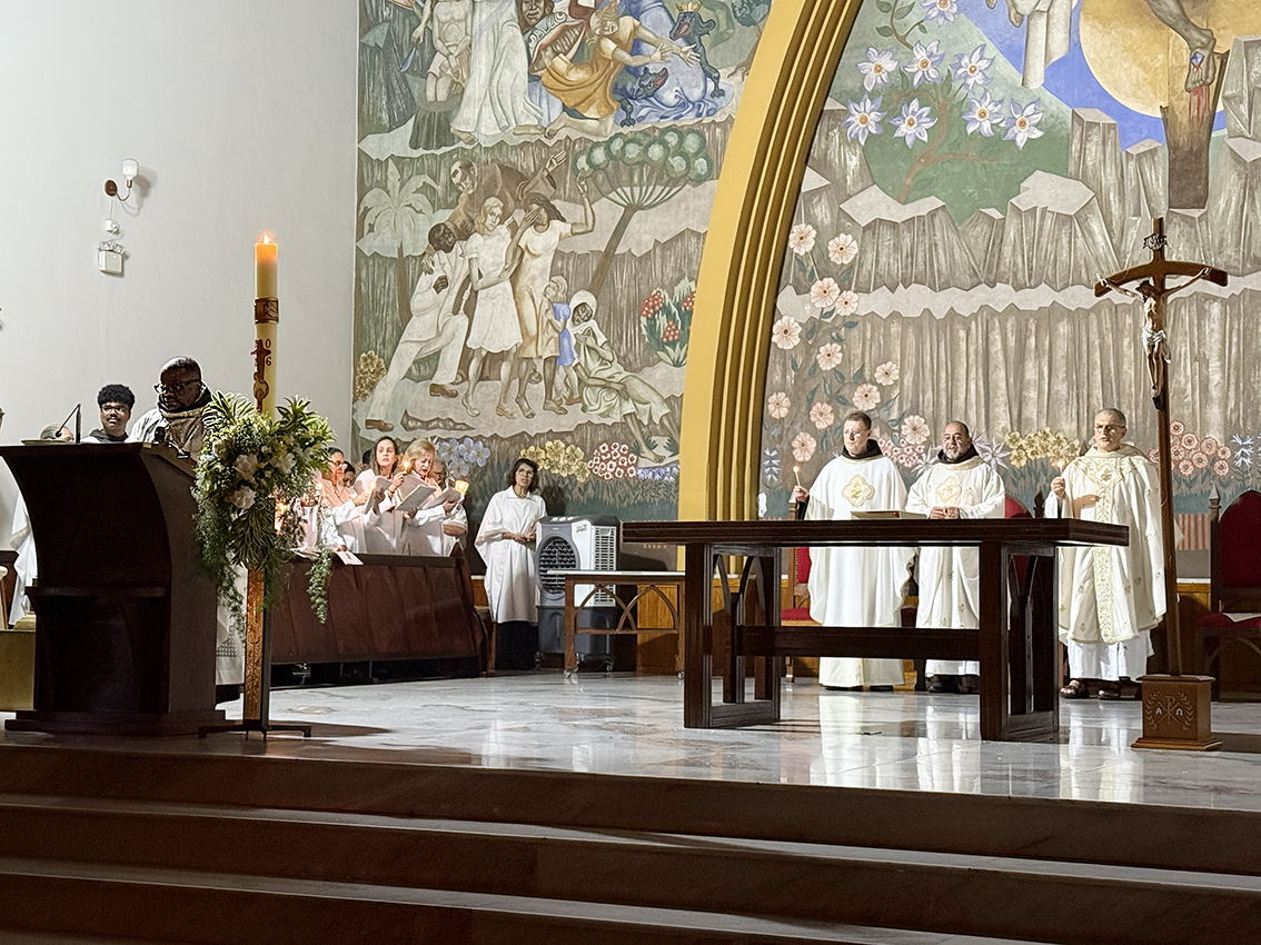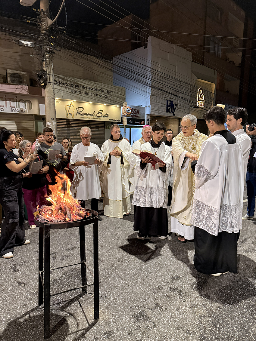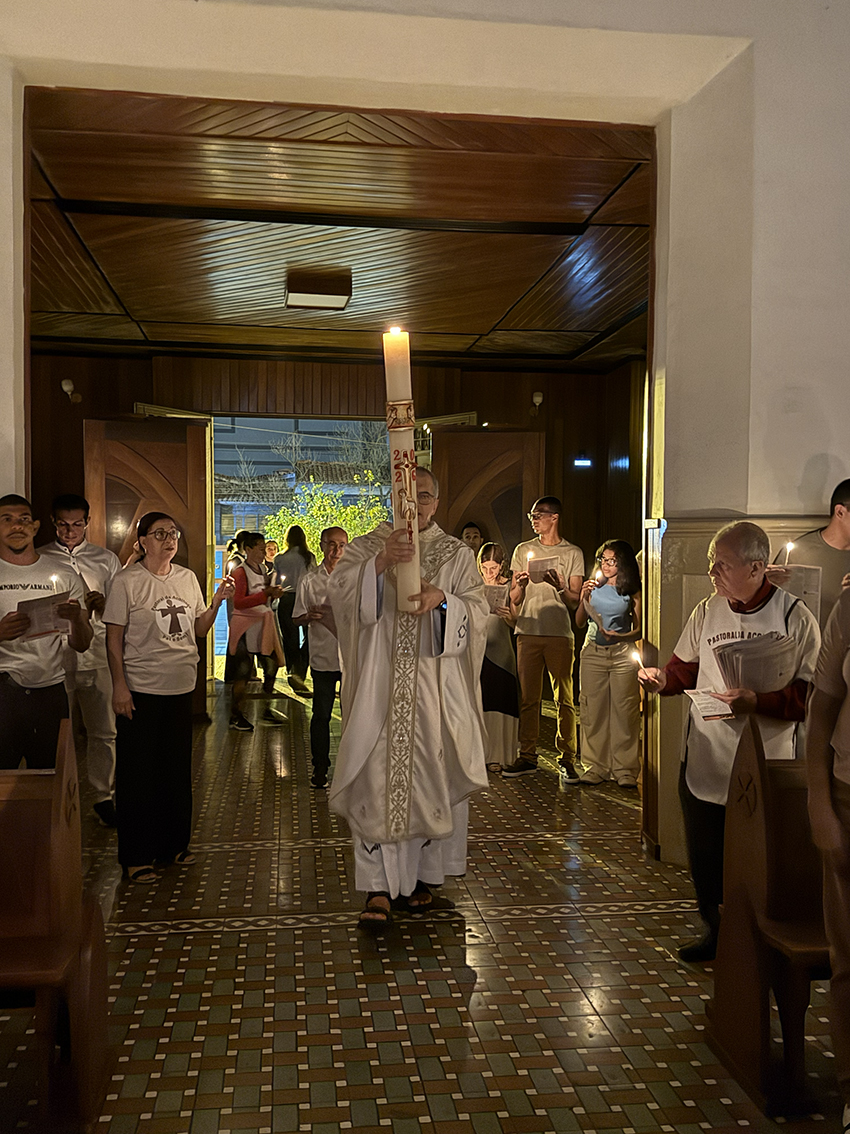 Às 19h, o Santuário Santo Antônio de Divinópolis se encheu de fiéis. A luz do círio pascal ainda não havia rompido as trevas, mas a expectativa já iluminava os rostos. Frei Massimo Fusarelli presidiu a Vigília Pascal, concelebrada pelo Definidor Geral para a América Latina, Frei César Külkamp, e pelos demais confrades sacerdotes da Fraternidade Santo Antônio. O evangelho proposto foi Mateus 28,1-10 – as mulheres que vão ao sepulcro e encontram o anjo, e depois o próprio Jesus. Frei Massimo iniciou sua homilia manifestando a grande alegria de estar celebrando a noite santa naquele Santuário, que, segundo ele,