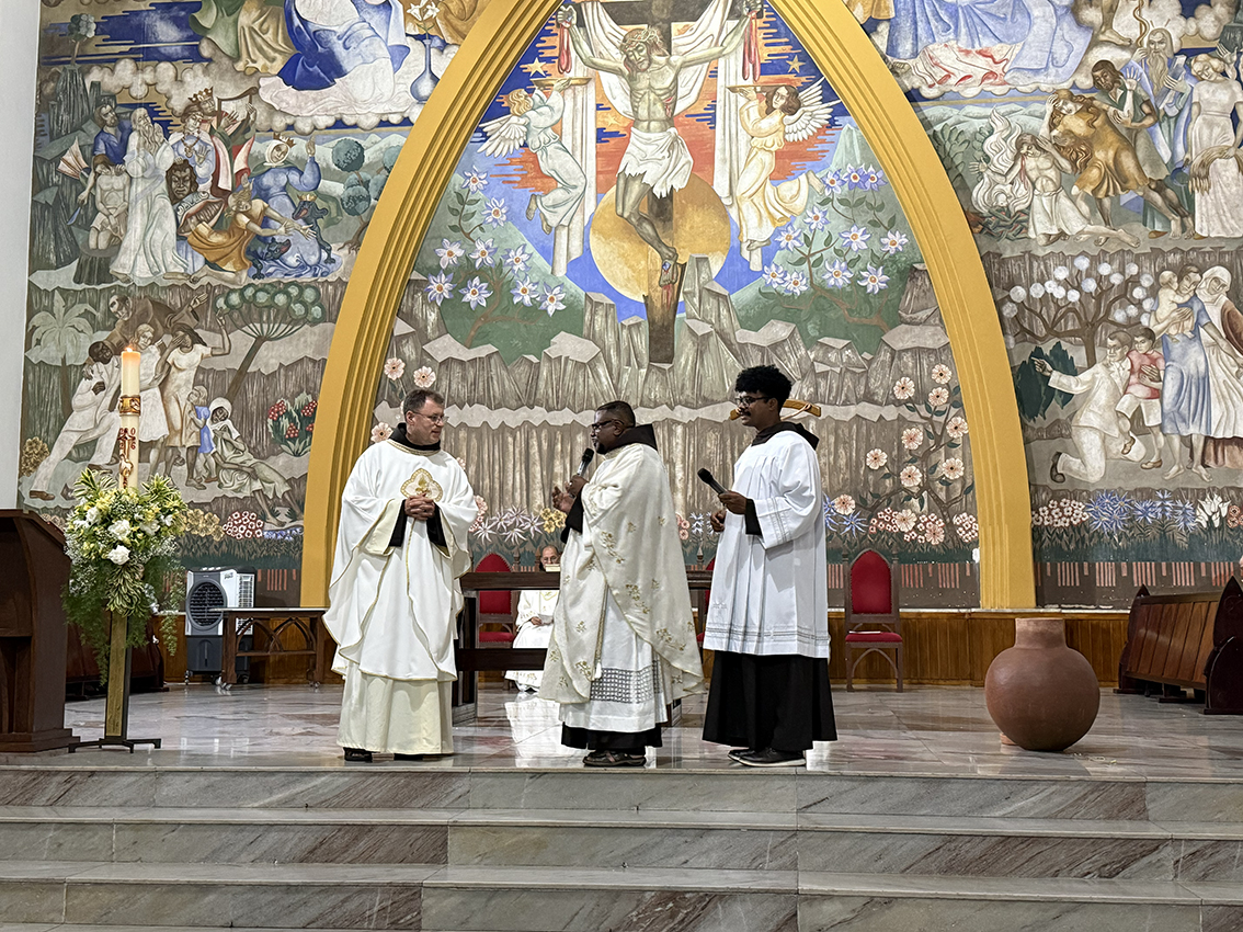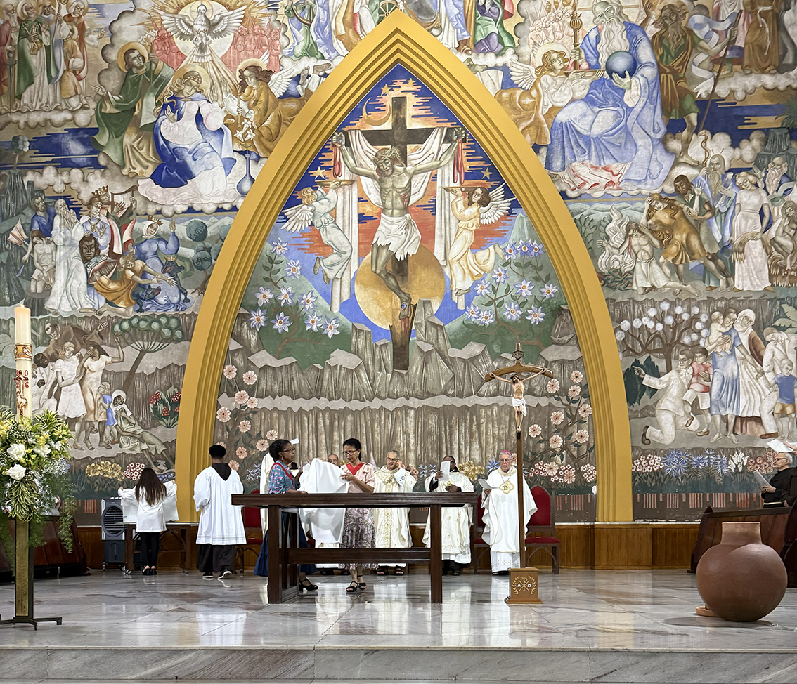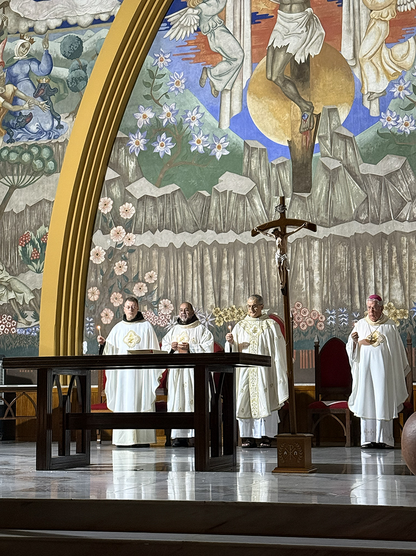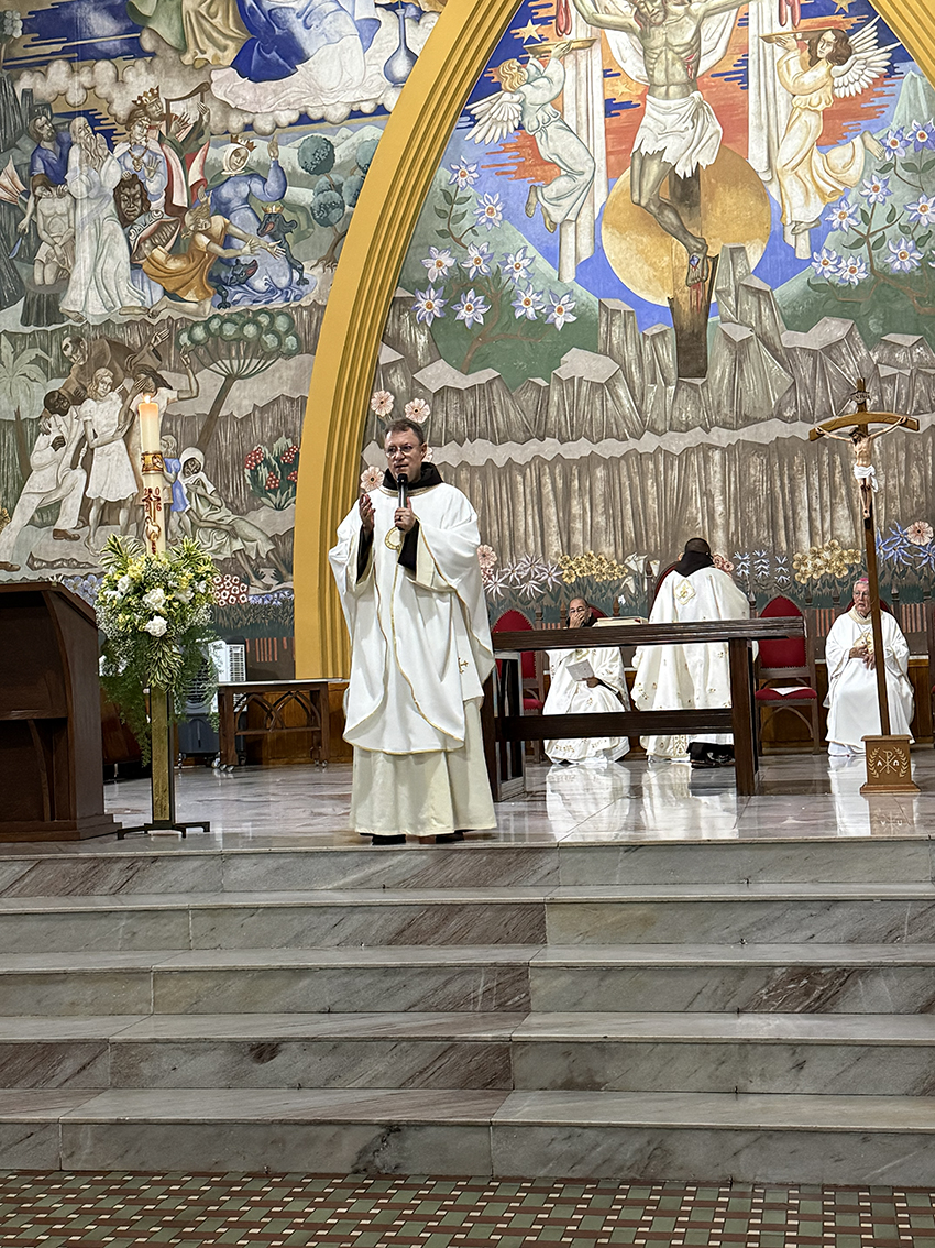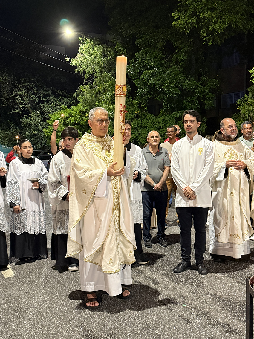 Às 19h, o Santuário Santo Antônio de Divinópolis se encheu de fiéis. A luz do círio pascal ainda não havia rompido as trevas, mas a expectativa já iluminava os rostos. Frei Massimo Fusarelli presidiu a Vigília Pascal, concelebrada pelo Definidor Geral para a América Latina, Frei César Külkamp, e pelos demais confrades sacerdotes da Fraternidade Santo Antônio. O evangelho proposto foi Mateus 28,1-10 – as mulheres que vão ao sepulcro e encontram o anjo, e depois o próprio Jesus. Frei Massimo iniciou sua homilia manifestando a grande alegria de estar celebrando a noite santa naquele Santuário, que, segundo ele,