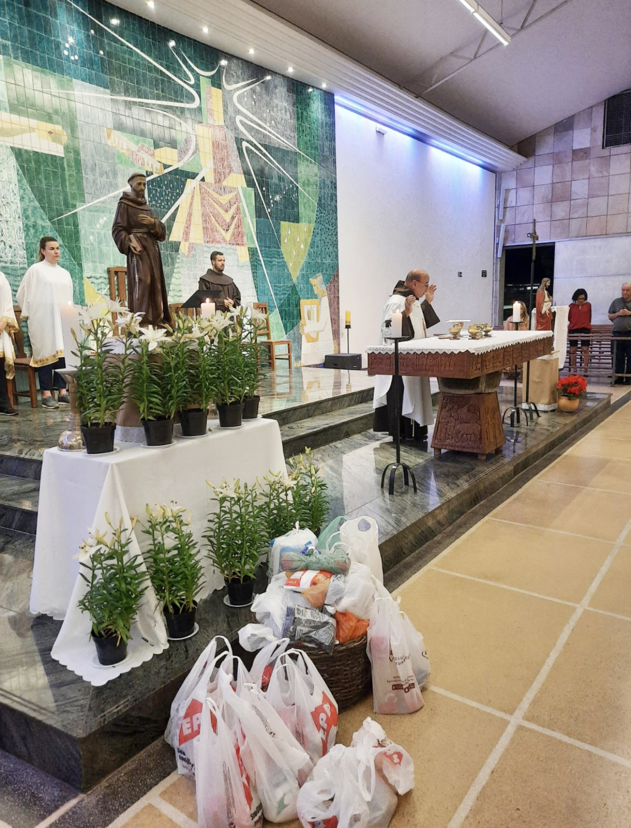 Com o objetivo de traduzir a espiritualidade em gestos concretos, a paróquia organizou uma campanha de solidariedade, arrecadando chinelos, fraldas geriátricas e itens de higiene pessoal. Os donativos foram destinados à Pastoral de Rua, que realiza o atendimento fraterno à população em situação de rua no entorno da paróquia.